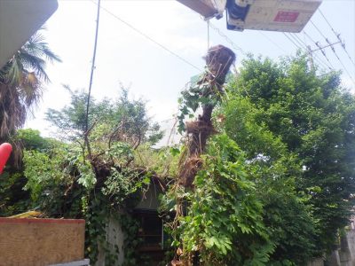 電線に掛かった樹木の枝を剪定と、ご依頼により伐採する工事を行いました。